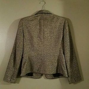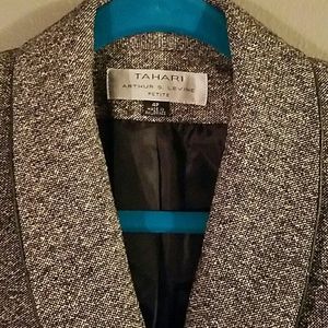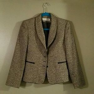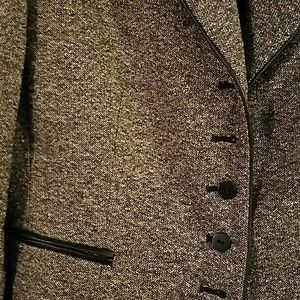 Rounded collar with faux leather trim edging the collar, torso piece, and pockets. 5 buttons in front. Great condition. Tahari Arthur S. Levine