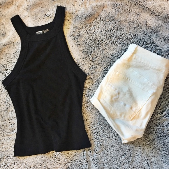 Cotton On ribbed tank. Says XS, but their clothes run a half to a size larger. Very comfy. Only worn once to an amusement park and washed. Arm holes are not low and cover up any bra straps. It's semi-cropped, it hits just below the belly button or at the top of high rise jeans.