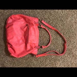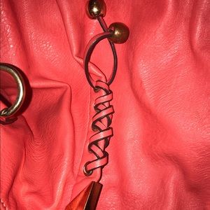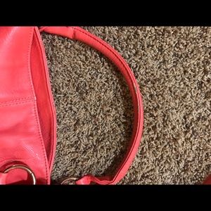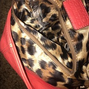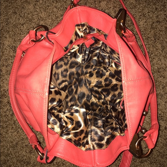 This purse is great! One of my favorites and because of that the small strap has a little wear and the inside of one of the pockets has a small tear (both seen in pictures) besides that the purse is in great condition. Very spacious. Comes with a long strap. Gold chain and features. The cheetah inside is such a great contrast to the coral outside