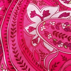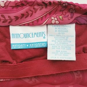 Maternity Spaghetti Strap tank w/Adjustable Straps & Built In Shelf Bra. It's an?empire waist silhoutte in pink, magenta, purple, cream with a little green floral and paisley print lightweight chiffon. It is trimmed in magenta velvet ribbon. The shelf bra is 96% Cotton and 4% Spandex.?