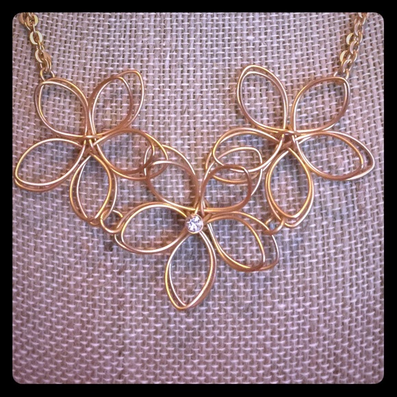 Make a statement with this brushed gold necklace. It is absolutely precious! Three 3D like flowers, the middle flower has a single cz for a touch of bling! 16" adjustable double chain. NWOT