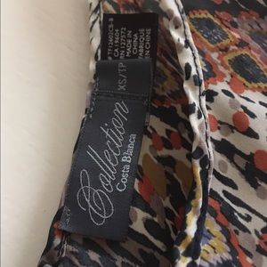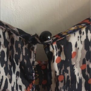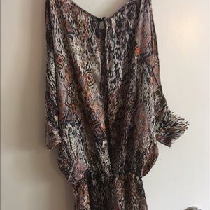 Great condition! It's a silky dress, with a very cool pattern. It has an open upper are area and the sleeves are about 3/4. Also has an open back, and an elastic band making the top appear loose and flowy and the bottom tight like a bodycon.