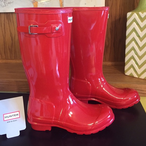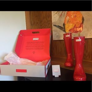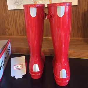 Brand new with box and tags fire engine 🚒 glossy red HUNTER Boots! big Girls size 6 which may fit a woman that's a size 7. I'm a size 8 and these are about 1/2 to 1 inch too small. The length and width were perfect though. I really liked that hey don't rub behind the knee as the adult boots do when you're 5'5 or shorter! Enjoy!