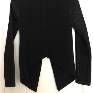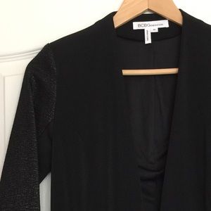 Like new BCBGeneration draped front jacket/blazer with metallic sleeves in XSmall. Only worn once and very briefly. DETAILS: shine from office to after hours in this sparkling blazer that features long sleeves with a touch of metallic. Open silhouette, long metallic sleeves, zip front pockets, lined.