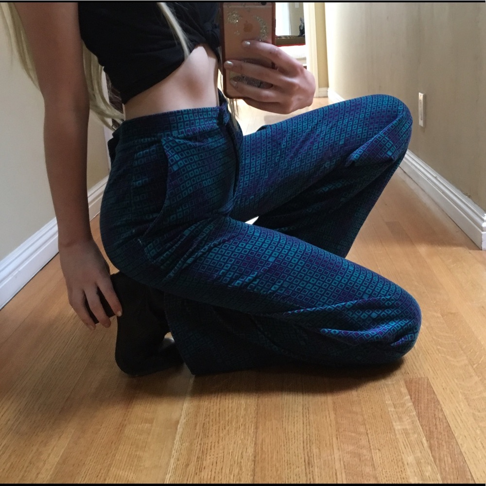 awesome vintage fendi pants with a trippy optical illusion design on super soft turquoise and purple velvet 🌀 these have a slight flare to the end~ the button to fasten them is missing but it still has the front clip~ these are pinned on me and would best fit a 27/28 (shown on 5'7 23W)