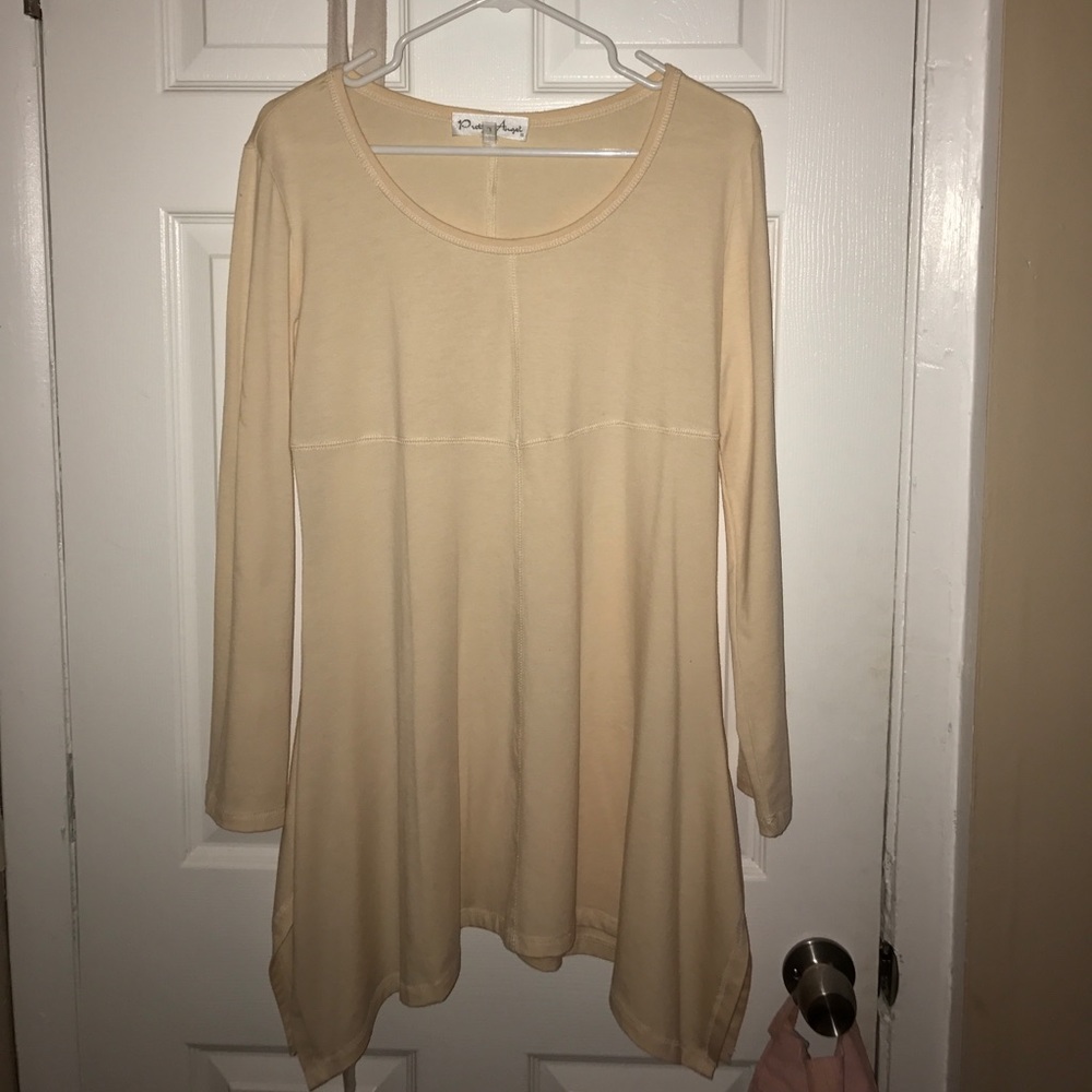 ivory tunic with shark bite hem. Long sleeves, Super comfortable.