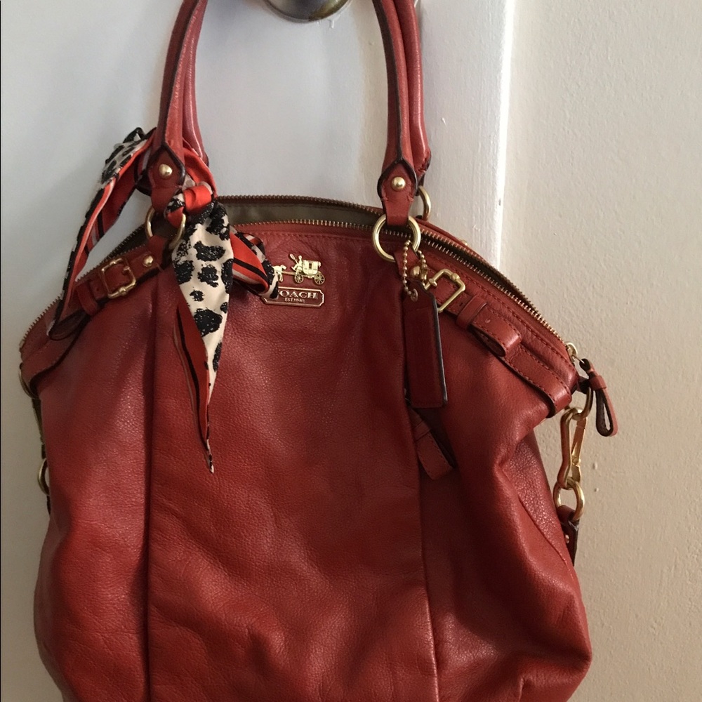This gently used Authentic Coach handbag is gorgeous!! The perfect burnt orange color. Used only a few times, no scratch marks, comes with dust bag and scarf as shown in pics.