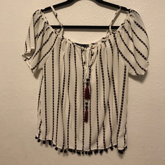 White off the should top with straps and tassel strings in center. Has black and red double arrows stripes. Has Pom Poms hanging at bottoms of shirt all around. Chiffon materials. Never worn.