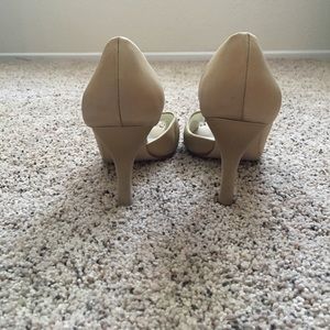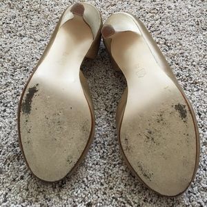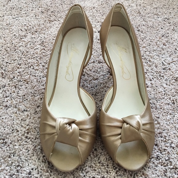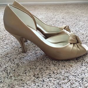 Gold satin peep toe pumps with elegant knot detail worn 3 times (all weddings). Versatile color and design goes with almost anything. Comfortable heel height. Originally from David's Bridal.