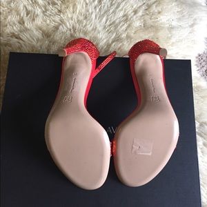 Red Swarovski embellished strap it heels. Never worn (half size too big). 4" heel. Very comfortable and one of a kind. Husband bought from Milan after Rossi show and was never able to wear them.