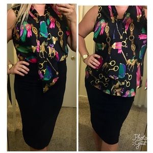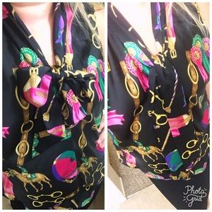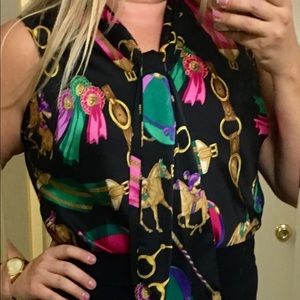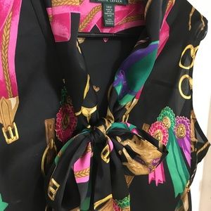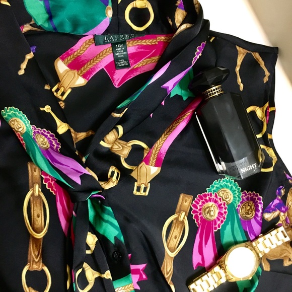 14W Silk RL Derby Blouse. Very elegant piece can be worn tucked in or out . Would match with a skirt or pants. Buttons up in the front with extension of collar that can be tied or left alone.