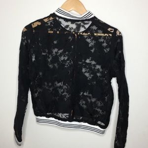 Sheer black floral bomber with striped contrast hems and rose gold zipper, from my personal collection, marked size small, only worn once, not nasty gal marked for exposure