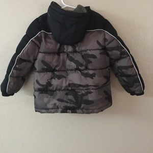 Camo and black puffer jacket.