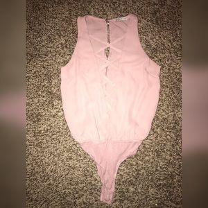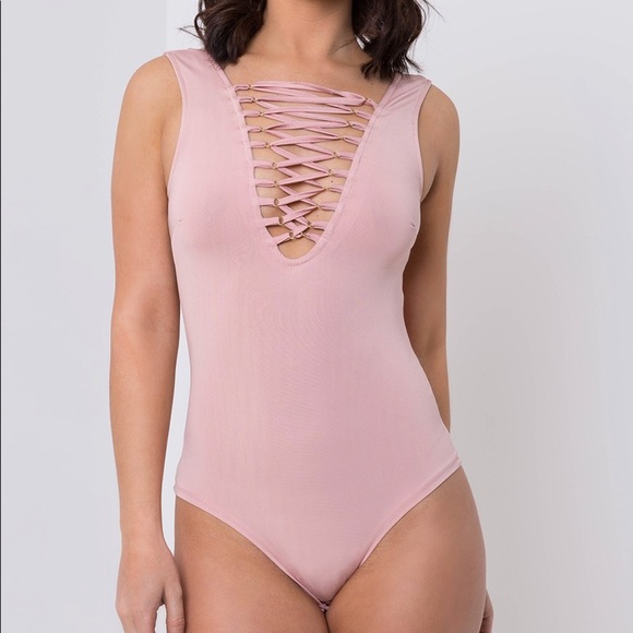 Pink Lace Up body suit, size M but runs very small like a size S. Fits SIMILAR to the model but model is not the exact shirt. I DO TRADE 🌟