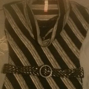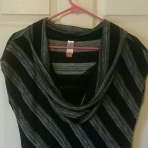 2 cowl neck tops that are not quite sleeveless. Red top has front pockets and is 28" long. Black (with black & black/gray stripes) top has a faux cami/lace trim attached under cowl neckline and is 32 1/2" long. Both have belt loops on the sides if a belt is desired. Good used condition!