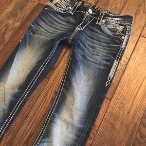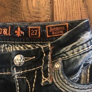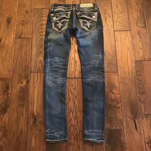 DETAILS... *BUCKLE* Rock Revival Extra Thick Stitch Medium Dark Acid Wash Flap Pocket Johanna Skinny Denim Jeans size 27 as tagged (also fits a size 26 comfortably) however please check measurements... 14.5" waist laying flat, 31" inseam, 5" to 5.5" leg opening... very gently laundry, please ask any questions prior to purchasing! :)