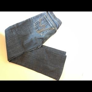 Good condition! No rips or stains. Low waist flare #109. Dark blue. Hardly any fading! From bottom of rise to bottom hem of jean is about 30 inches & from top of hip at the side to bottom hem is about 38 inches.