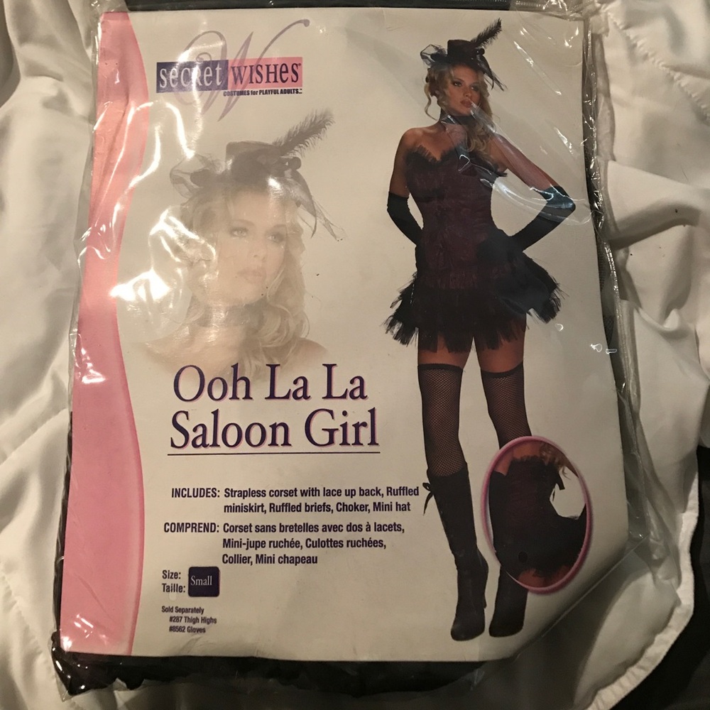 Comes with strapless corset with lace up back, ruffled miniskirt, ruffled briefs, choker and a mini hat. Size SMALL. This costume is way too small for me therefore I can not model it for you! This is made by secret wishes.