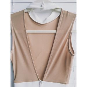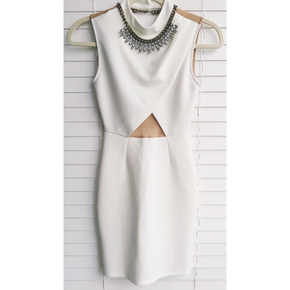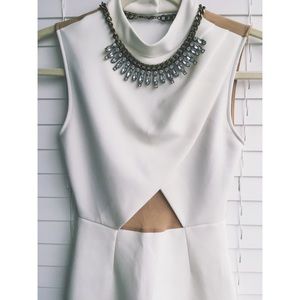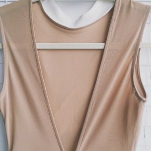Beautiful form fitting white and tan dress sleeveless dress with collar and deep v open back. Good condition - only flaw shown in last photo.