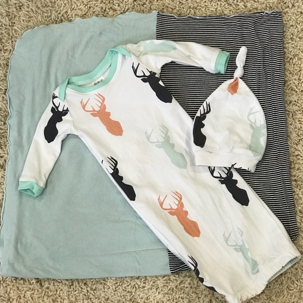 Your baby will be the star attraction in this organic cotton gown, matching knot hat and swaddled in the color block stretchy knit blanket. #smokefree #newbaby #handmade