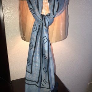 Scarf and more of natural tones. Light blue & Navy blue and a hint of pink. Cute fringes on the end:)
