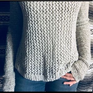 Comfy cable knit sweater with scooped back and slouchy sleeves.