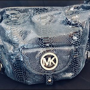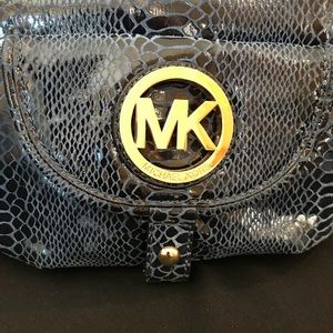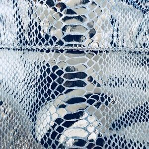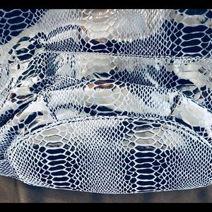 Color: Navy Blue Patent Leather Python print with gold embellishments