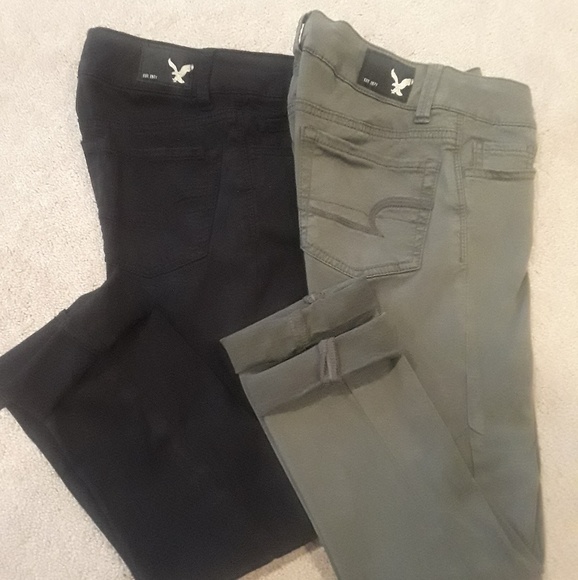 Artist Crop American Eagle super stretch jeans in great shape, worn two times. Size 0. Black and olive green. 2 pairs for $22.