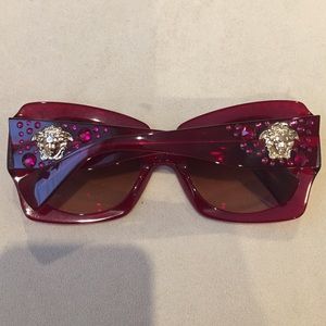 Swarovski type stones in the frame located on the front and the side. They have a brown gradient lens with the oversized Versace Medusa logo on the arm in gold. They come with a generic case. THE PRICE IS FIRM❗️NO HAGGLING❗️NO TRADES❗️