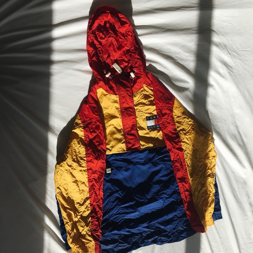 GREAT CONDITION TOMMY HILFIGER WINDBREAKER THAT ACTUALLY FOLDS INTO A BAG. SUPER UNIQUE ITEM, SOME PEOPLE ARE ASKING CLOSE TO $600.00 FOR THIS VINTAGE ITEM, WHICH I THINK IS CRAZY. I WILL LIST IT, AND FEEL FREE TO OFFER!