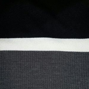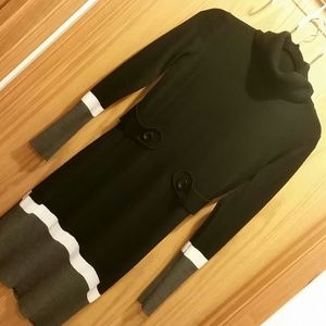 Turtle neck sweater dress. I'm 5'3" and the dress length was to my knees. Waist has 2 button embellishments. The dress is sewn in an hourglass shape. There is some slight piling. Colors are black, white and grey.