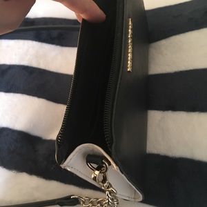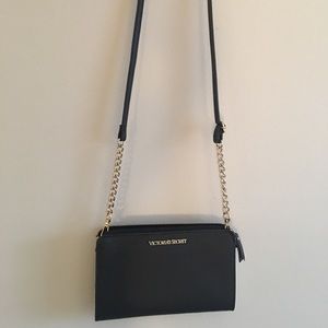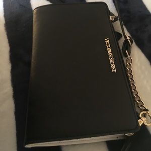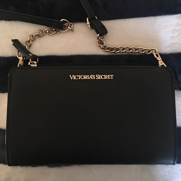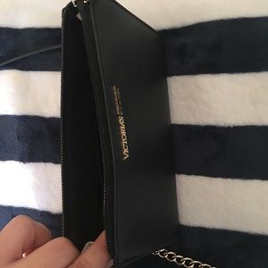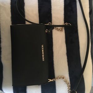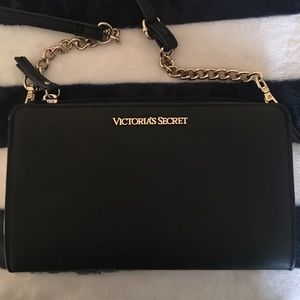 Authentic Victoria’s Secret chic black bag💖 Smooth back and white exterior, silky back interior lining, interior zip pocket• gold chain accents • gold tone hardware • removable long Crossbody strap • Can wear as a Crossbody or remove strap and hold as a clutch. Very versatile💖. Appx: 8 1/4” x 5”. Will fit iPhone plus.