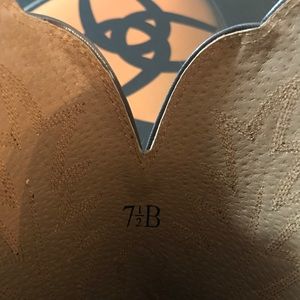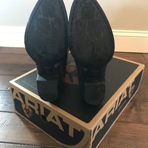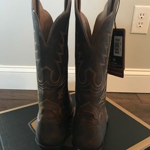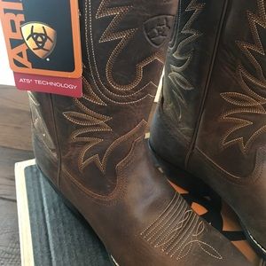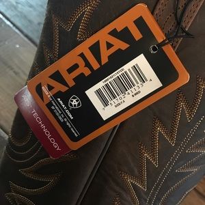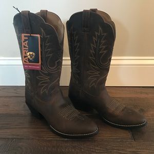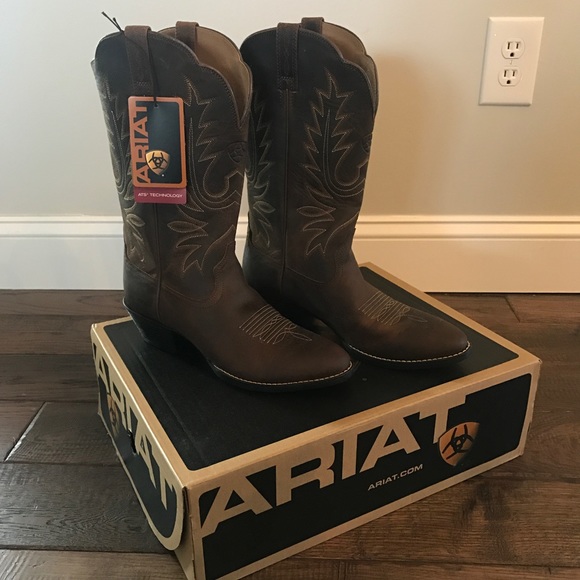 Up for sale is a BRAND NEW pair of women's Ariat boots size 7.5 B Med (7 1/2) with original tags and box. These boots are a round toe style and are made of shades of darker brown leather and has a stitched design. Asking price is negotiable so plz make a reasonable offer. These are from a SMOKE FREE home. :)