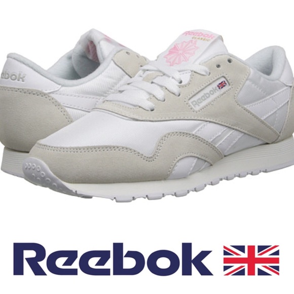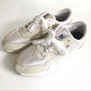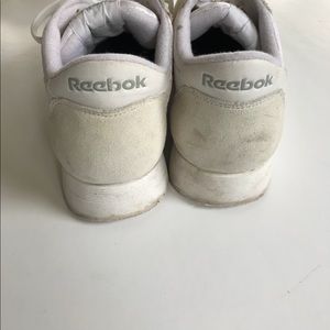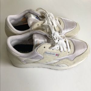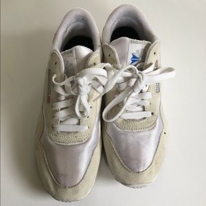 Cream & white classic Reebok nylon/suede sneakers. I literally only wore them once but it happened to be raining so they got a little dirty. Other than that no flaws. I ran out of sneaker cleaner but they should be 100% clean with a little love!