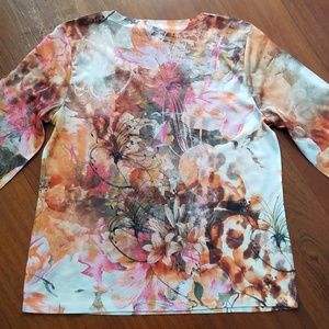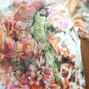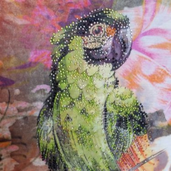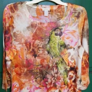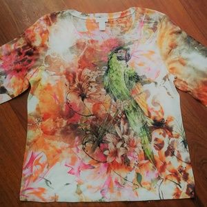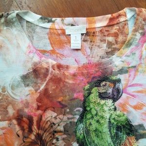 Chico's Tee Shirt features 3/4 sleeves with a bright printed floral design and a rhinestone embellished green parrot. Material is 100% Polyester for easy cleaning and wearing. Size 1 (14/16).