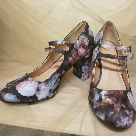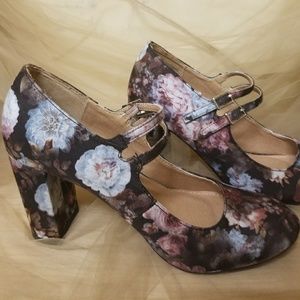Multi-colored flower detailed heels with two strap detailing. Good condition and worn once.