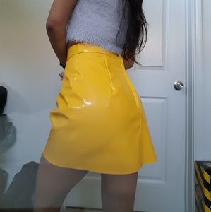 Fun in the Sun! Bright Yellow Polyester PVC skirt!! Looks like raincoat material! But this is super fkin cute if youre looking for that statement piece! Its from American Apparel. Size S. Worn a couple of times, has no flaws. Practically new!! Its highwaisted and best fits sizes 24-26in in waist.