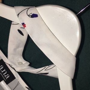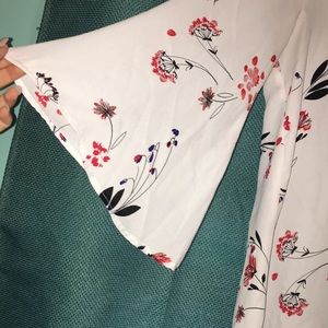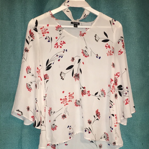 mainly red - pops of red and black - flowy sleeves - v neck - has a strap that buttons around the neck but you can take it off too - (its an xs but its loose)