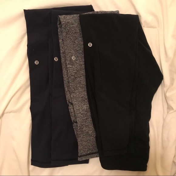 Out to Lunge Untight Tight Lulu Leggings!! Selling together not separate. 2 Navy blue, a black, and a grey. They were too big and i’m a size 8. They show size 8 but feel like a 10-12.