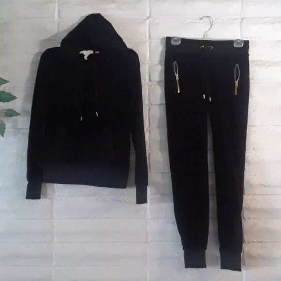 Gorgeous black velvet tracksuit with gold metal accents. Joggers also have gold metal zippers for the pockets. Pair comes with black velvet hoodie and joggers. Loved it but sadly have to let it go as I have hardly made use of it. Machine washed once, great condition.