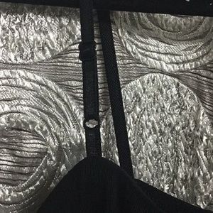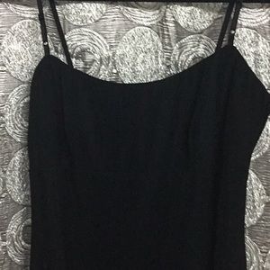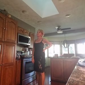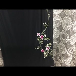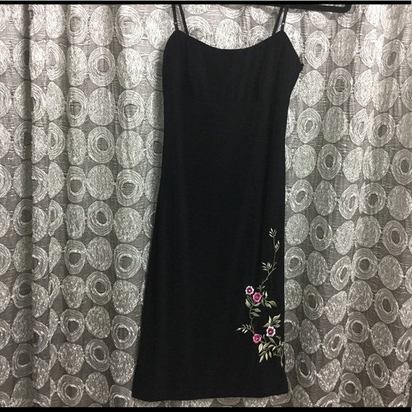 Sexy slinky black nylon and spandex dress . The embroidered floral really pops against the black! Knee length with zipper on the side.also slits up both sides 6 inches. Shelf bra.