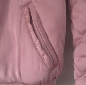 Cute rosy pink zip up jacket with a satin like material. Quilted pattern on the sleeves. Two pockets on either side. Lightly worn. Small marks on front (see last photo) but not bad. Otherwise great condition.