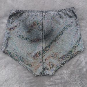 WORN ONCE! In perfect condition. Ravewithmigente Laser Beam Hot Shorts. SOLD OUT everywhere. Stretchy and insanely comfortable. High waisted holographic fabric looks amazing in the sunlight! These fit me more like swimsuit bottoms than shorts style on model in photo (I'm a size 10-12). Turn heads at the function 💥