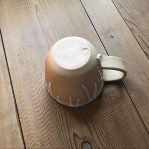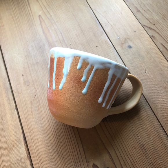 Wheel-thrown, stoneware mug is glazed in white and warm green over orange stone clay.