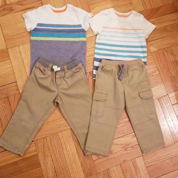 2 pair of Carter's pants size 18 months. 2 Cat and Jack shirts size 18 months. Good condition smoke free and pet free home.
