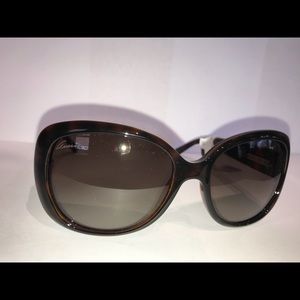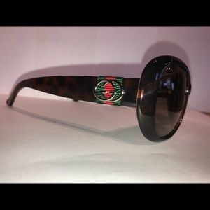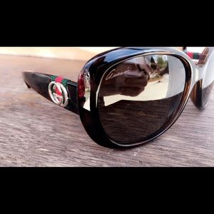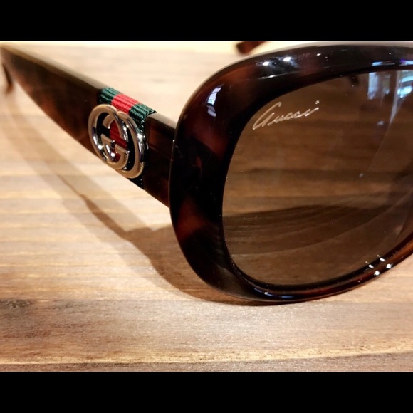 Gucci dark tortoise sunglass with side detail: signature red and green stripe with interlocking Gs