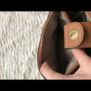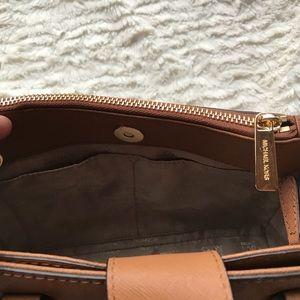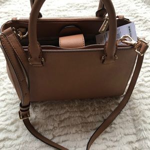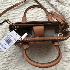 NWT MICHAEL KORS Kellen studded XS handbag in Acorn. Saffiano Leather. Detachable crossbody strap. Never used. One zip closure and one snap closure pocket on outer sides of purse. One zip closure and 4 open pockets inside of purse.