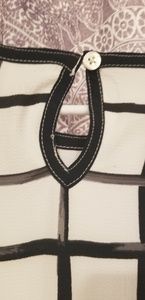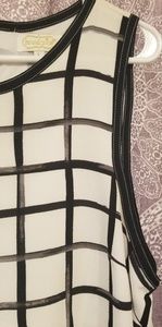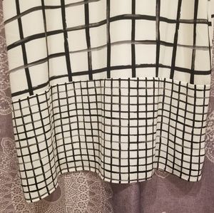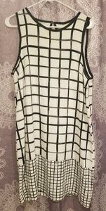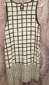 Black, white and grey dress with brush square detail with contrast feature at the bottom. worn only once in great condition. Can fit a size 12 and 14 ๐