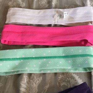 4 lululemon headbands!! The white, green and pink one are the same style and have grips in the inside and the purple one is more wider and made out of a different cloth, the white headband is a little dirty but they all can be cleaned if you would like me to wash them before i ship them if you wish to purchase them!