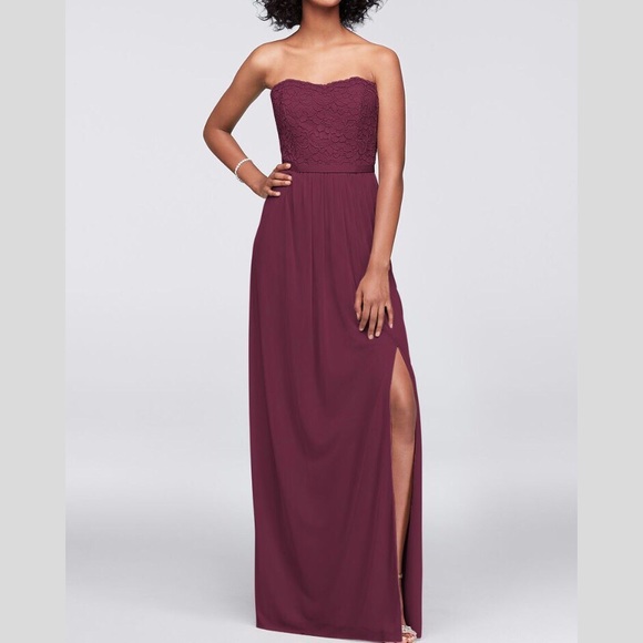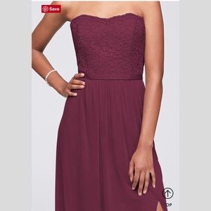 Wine/burgundy gown. Size 2. Worn once. Great condition! Strapless and has a lace overlay on the top! Perfect for prom or bridesmaids